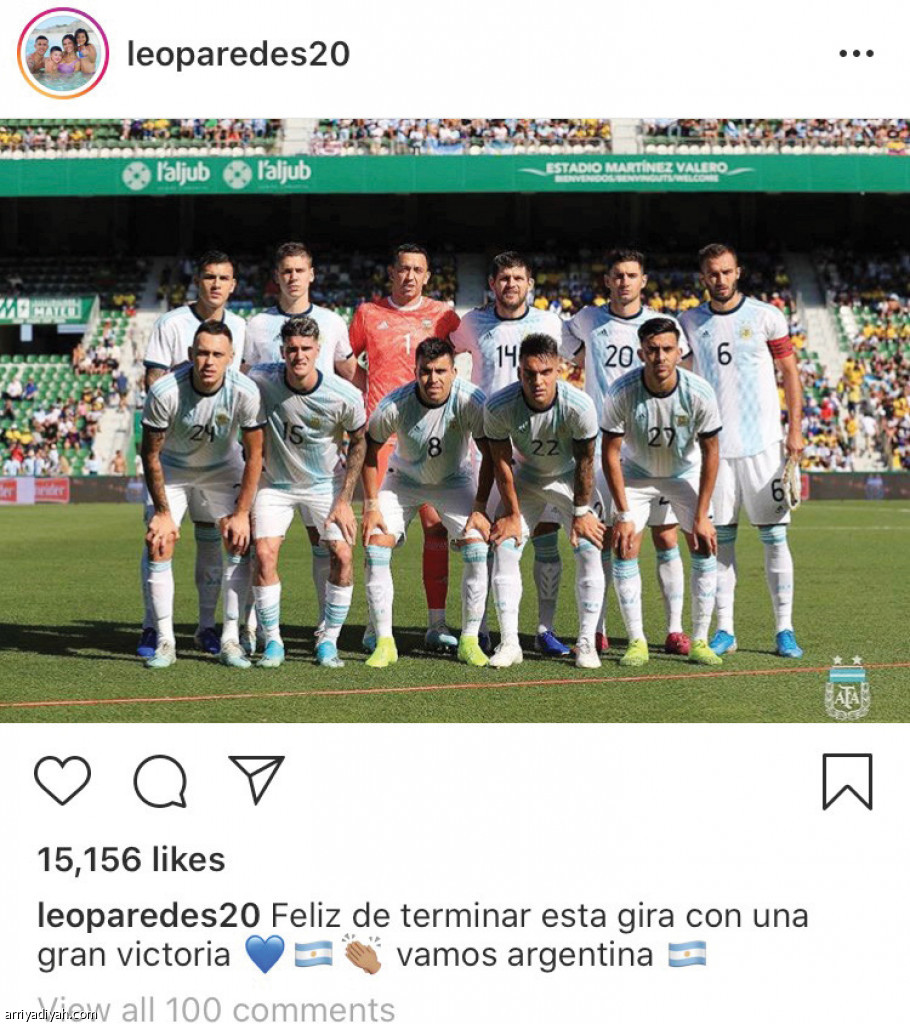 نشره ليوناردو باريديس، لاعب منتخب الأرجنتين الأول لكرة القدم، عبر حسابه الرسمي في منصة التواصل الاجتماعي “إنستجرام”، بوست بعد الفوز على الإكوادور في مباراة تجريبية أمس، قال فيه: “مباراة وانتصار مهم، ومنتخب عظيم”. ونال الـ “بوست” نحو 15 ألف إعجاب في أقل من ساعة.