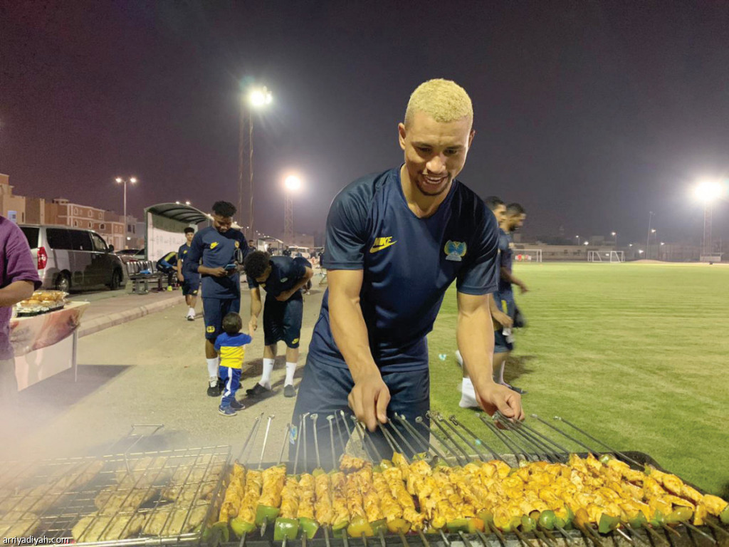 نظمت إدارة نادي الجيل مأدبة عشاء، لعناصر الفريق الأول لكرة القدم، بعد نهاية الحصة التدريبية، وذلك في إطار تحضيرات الفريق للمواجهة المقبلة أمام حطين مساء اليوم على ملعب الأمير عبد الله بن جلوي في الأحساء لحساب الجولة التاسعة من دوري الأولى.. وفي الصورة التي التقطت مساء أمس الأول، يظهر البرازيلي سيدفالدو بيريرا مهاجم الفريق يعد بعض المشاوي (المركز الإعلامي ـ الجيل)