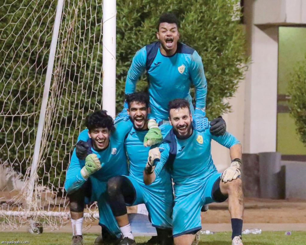 صورة التقطت أمس لحراس فريق أحد الأول لكرة القدم أثناء الحصة التدريبية للفريق استعدادًا لمباراة النهضة اليوم (المركز الإعلامي ـ أحد)