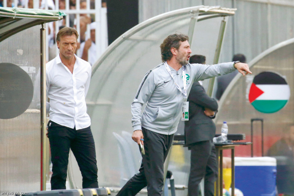 ترك الفرنسي باتريس بوميل مساعد مدرب المنتخب السعودي الأول لكرة القدم مقعده على الدكة ووقف على الخط لتوجيه اللاعبين أثناء مجريات لقاء فلسطين..