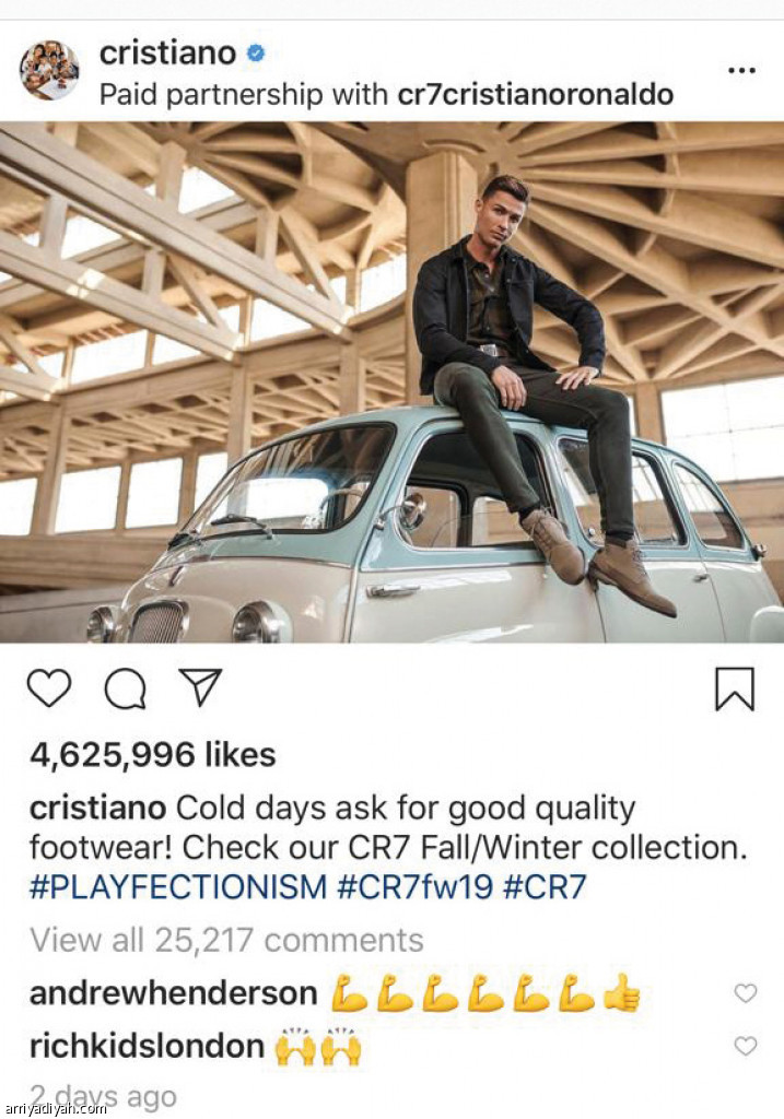 دشن البرتغالي كريستيانو رونالدو، لاعب فريق يوفنتوس الإيطالي الأول لكرة القدم، على حسابه في "إنستجرام" مجموعته الجديدة من أزياء الشتاء والخريف، التي تحمل العلامة التجارية CR7. وظهر اللاعب على ظهر إحدى السيارات القديمة للترويج عن المجموعة الجديدة. الصورة حصدت إعجاب 4.6 مليون متابع .