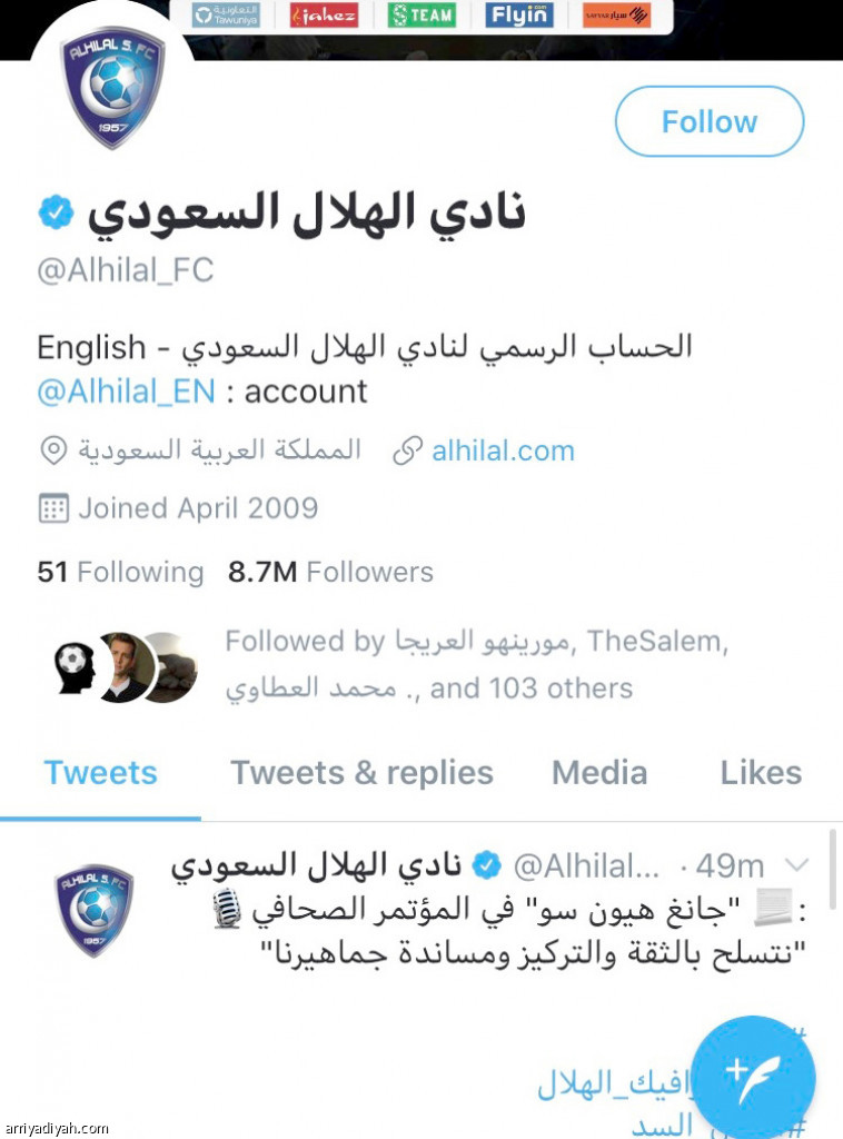 8.7 مليون متابع فيما يبلغ عدد متابعي حساب السد نحو 117.6 ألف. الأمر الذي يعني تفوق الهلال بـ 8.5 مليون.