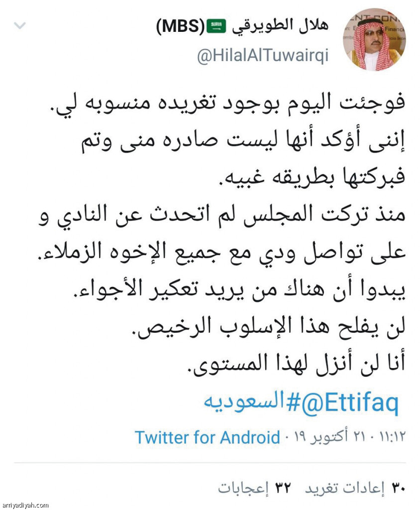 وأكد الطويرقي، في سلسلة من التغريدات أمس، أنه تفاجأ بوجود تغريدة منسوبة إليه، وتم فبركتها بطريقة وصفها بالغبية، مشددًا على أنه منذ تركه المجلس التنفيذي لم يتحدث عن النادي، وأضاف: "يبدو أن هناك من يريد تعكير الأجواء".