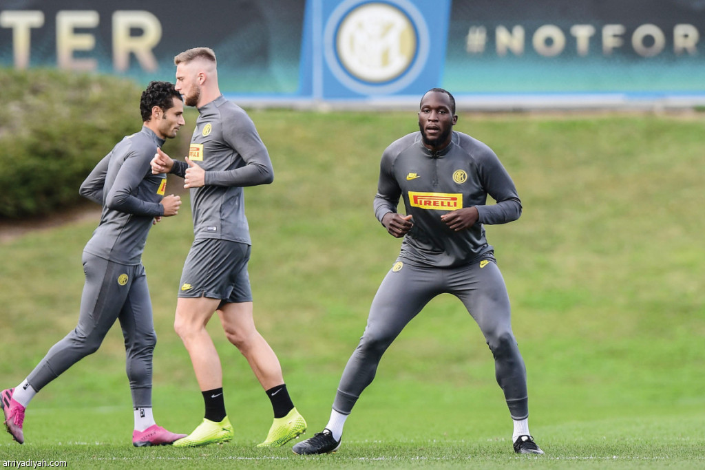 صورة التقطت أمس للبلجيكي روميلو لوكاكو والسلوفاكي ميلان سكرينار والإيطالي أنطونيو كاندريفا أثناء الحصة التدريبية لفريق إنتر ميلان الإيطالي على ملعب أبيانو جنتيلي الذي تنتظره مباراة اليوم في دوري أبطال أوروبا أمام بوروسيا دورتموند الألماني