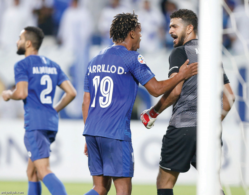 عاد عبد الله المعيوف حارس مرمى فريق الهلال الأول لكرة القدم إلى التشكيلة الأساسية أمام السد القطري بعد غيابه بداعي الإصابة.. وفي الصورة التي التقطت أمس المعيوف يظهر حماسًا كبيرًا وسط تشجيع كاريلو زميله بعد تصديه لإحدى الكرات تصوير: بدر الحمد