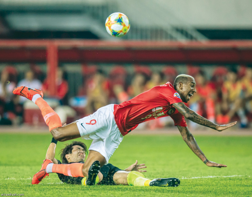 صورة التقطت أمس لأندرسون تاليسكا لاعب جوانزو الصيني وأكويا إيوانامي لاعب أوراوا يسقطان على الأرض بعد صراع على الكرة (الفرنسية)