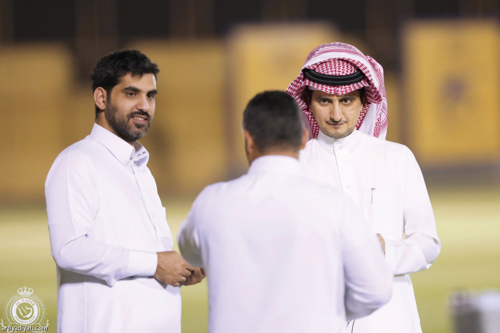 صورة التقطت أمس لعبد الرحمن الحلافي المشرف العام على الفريق الأول في نادي النصر وأحمد الغامدي مدير الكرة يستمعان إلى أحد الموظفين تصوير: عبد العزيز النومان