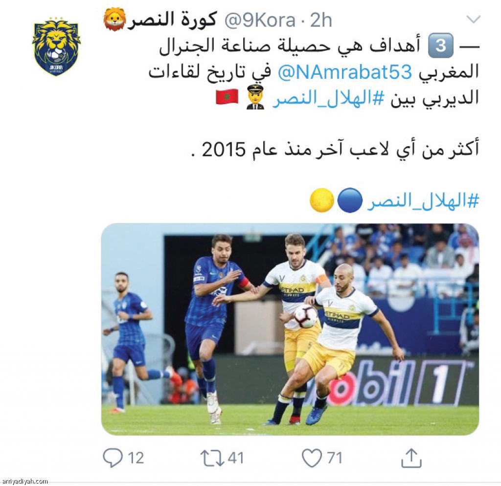 يضع النصراويون كامل ثقتهم في المغربي نور الدين أمرابط، في مباراة الديربي أمام الهلال، اليوم، ضمن منافسات الجولة الثامنة من الدوري السعودي للمحترفين على ملعب جامعة الملك سعود. وجاءت هذه الثقة، بعدما تناقل النصراويون في منصات التواصل الاجتماعي إحصاءات المغربي في المباراتين اللتين شارك فيهما أمام الهلال منذ انضمامه إلى النادي العاصمي، حيث ساهم في ثلاثة أهداف خلال مباراتين أكثر من لاعبي الفريقين منذ عام 2015م.