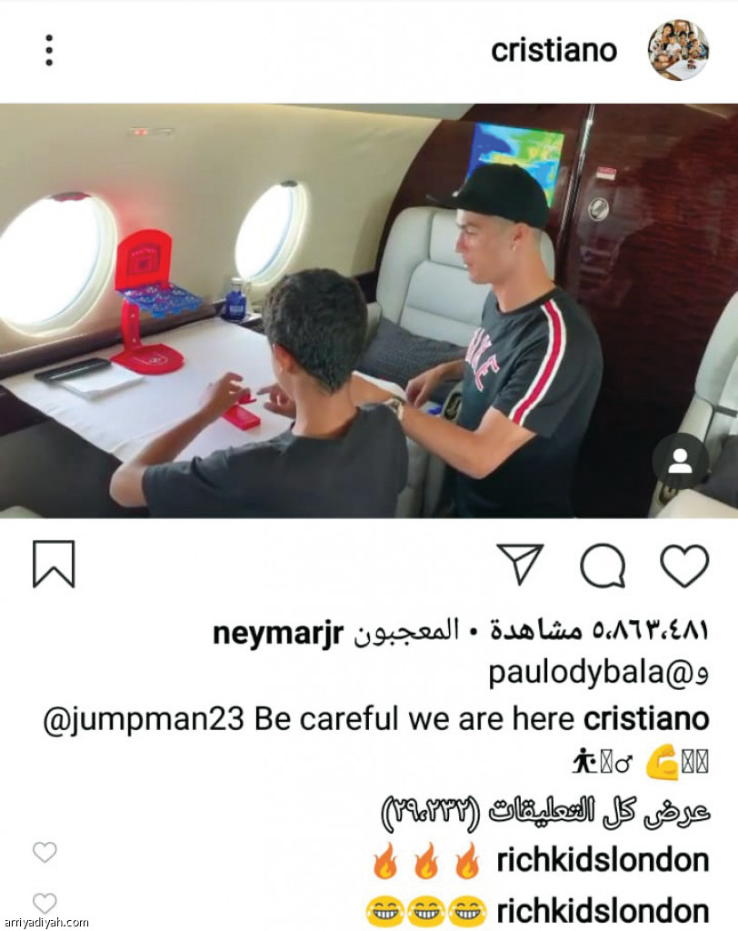 بثَّ البرتغالي كريستيانو رونالدو مقطع فيديو، في حسابه على “إنستجرام”، وهو يلعب فيه مع ابنه داخل طائرته الخاصة. وعلَّق رونالدو، على الفيديو قائلاً: “كن حذرًا”، حيث حظي بنحو 6 ملايين مشاهدة.