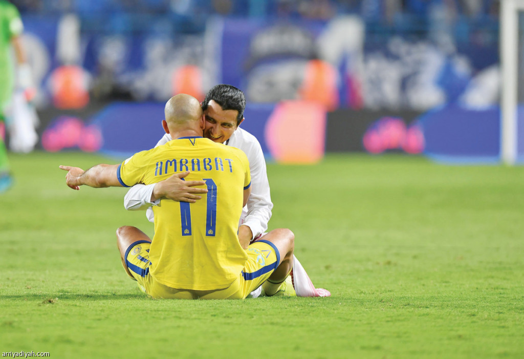 احتفل عبد الرحمن الحلافي، المشرف على كرة القدم في نادي النصر، بعد تحقيق فريقه الفوز على الهلال برفقة المغربي نور الدين أمرابط في وسط الملعب عقب إطلاق الإسباني حكم المباراة صافرة النهاية