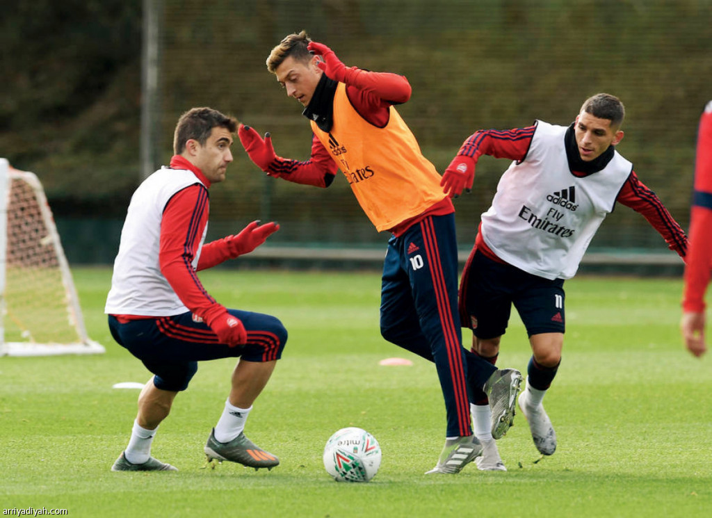 صورة التقطت أمس يظهر أوزيل يحاول المرور من الأوروجوياني لوكاس توريرا واليوناني سوكراتيس باباستاثوبولوس أثناء الحصة التدريبية لأرسنال (المركز الإعلامي ـ أرسنال)