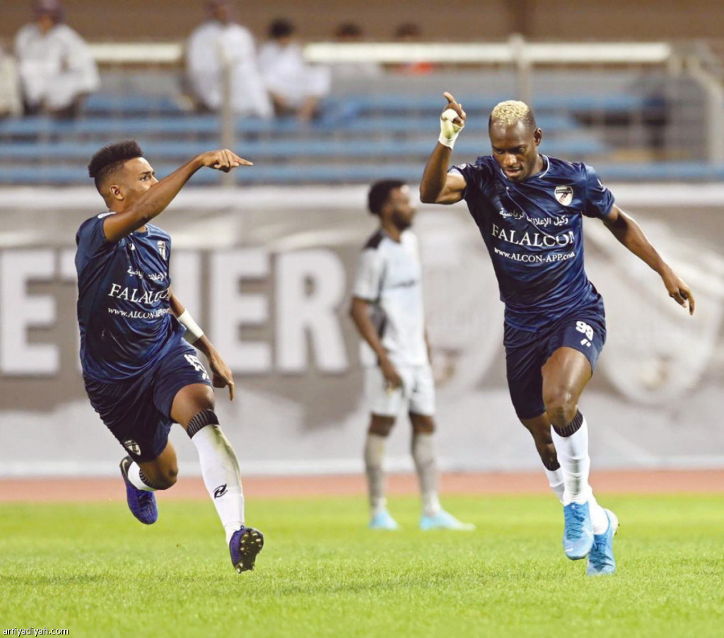 صورة التقطت أمس للعاجي إبراهيم سوري يحتفل بهدفه الثاني في شباك الطائي مع مشاري القرني زميله في الفريق (المركز الإعلامي ـ دوري الأولى)