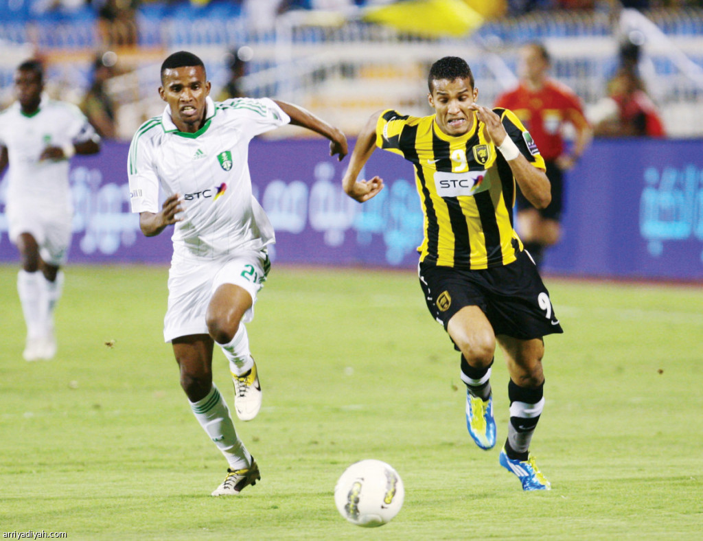 صورة التقطت لنايف هزازي مهاجم الاتحاد ينطلق بالكرة وسط متابعة عقيل بلغيث مدافع الأهلي خلال المباراة التي شهدت الفوز الاتحادي الأخير في الديربي بنتيجة 1-0 ضمن الجولة 24 من الدوري موسم 2011ـ2012 (أرشيفية)