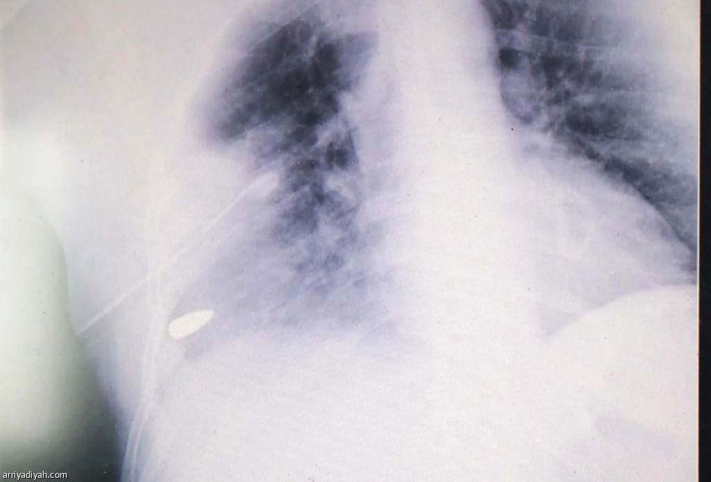 صورة التقطت للأشعة الضوئية التي أجريت لمدرب الشعلة تُظهر استقرار الرصاصة في جسده (خاصة بالرياضية)