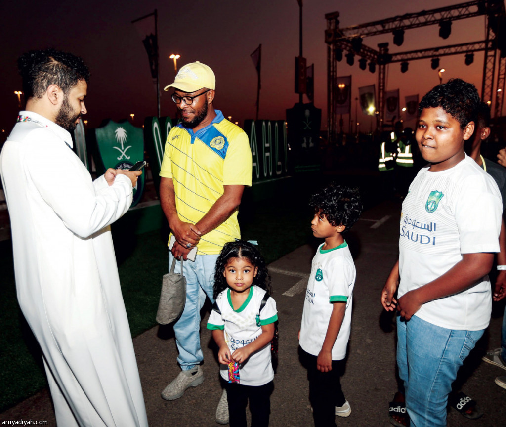 صورة التقطت لسالم الجمعان يرتدي شعار النصر.. وإلى جانبه أبناؤه يرتدون قمصان الأهلي في طريقهم إلى الملعب تصوير: وهبان خبتي