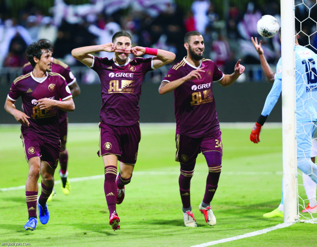 في الصورة التي التقطت أمس يحتفل جوستافو بطريقة "الشنب" المعتادة مع الغامدي والهولندي الجبليتصوير: مشعل القدير