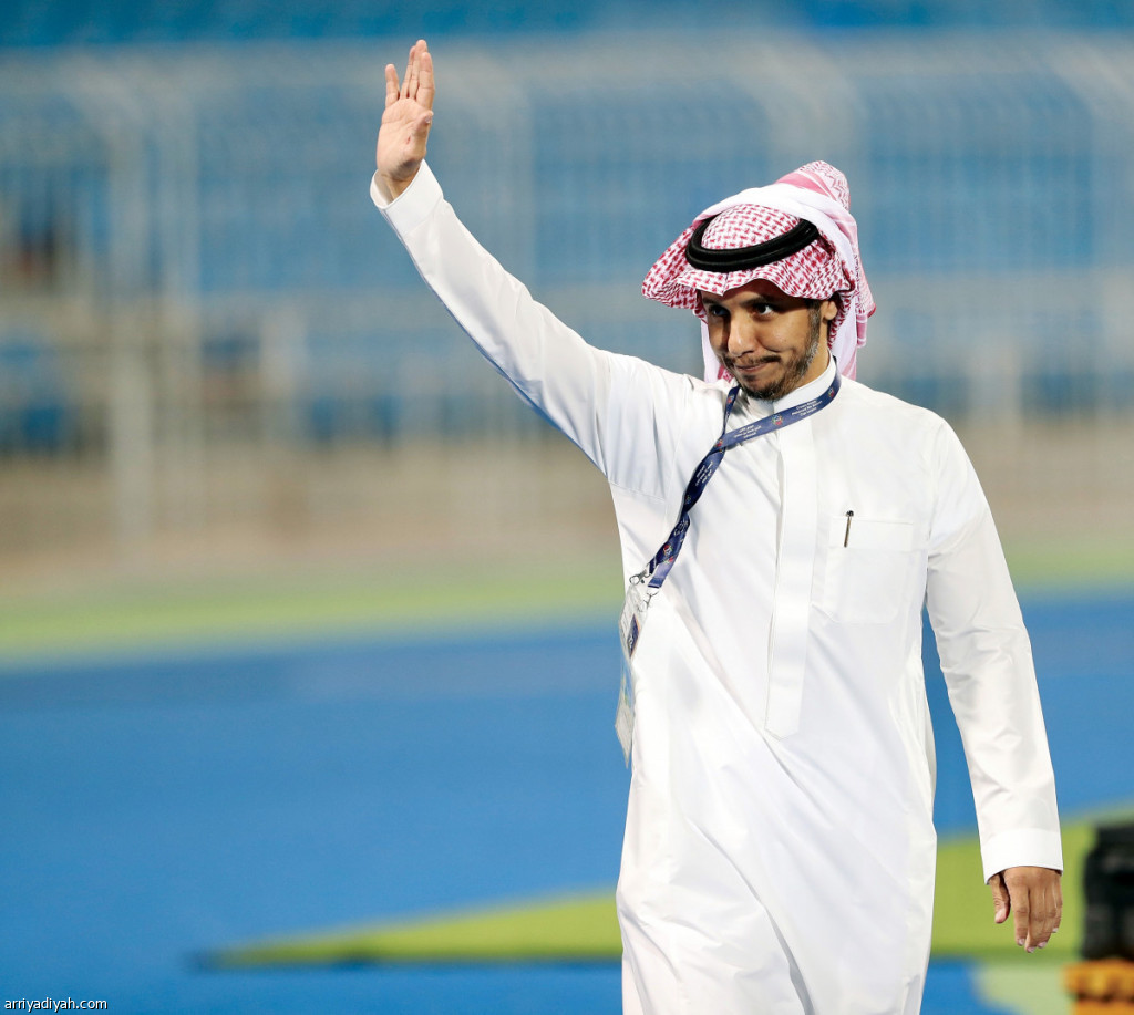 توجه صفوان السويكت رئيس نادي النصر إلى الجماهير بعد نهاية مباراة أبها للاحتفال بالفوز الكبير 4ـ0.. وفي الصورة التي التقطت السويكت يحيي النصراويين في مدرجات ملعب الأمير فيصل بن فهد في الملز تصوير: عبد العزيز النومان