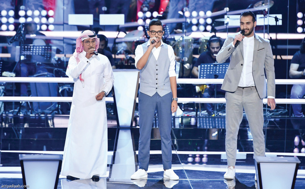 صورة التقطت أمس الأول لسلام وعبد العزيز إبراهيم وإبراهيم المشولي أثناء مشاركتهم في The Voice (المركز الإعلامي ـ mbc)