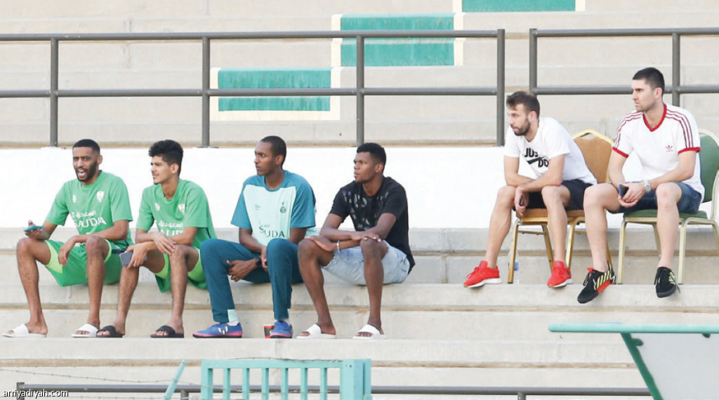 صورة التقطت أمس لعدد من لاعبي فريق الأهلي الأول لكرة القدم يتابعون مواجهة جدة وحطين في الكأس التي احتضنها ملعب ناديهم.. ويظهر البوسنيان زوكانوفيتش وساريتش ومحمد الربيعي وعبد الباسط هندي ومهند عسيري تصوير: عدنان مهدلي