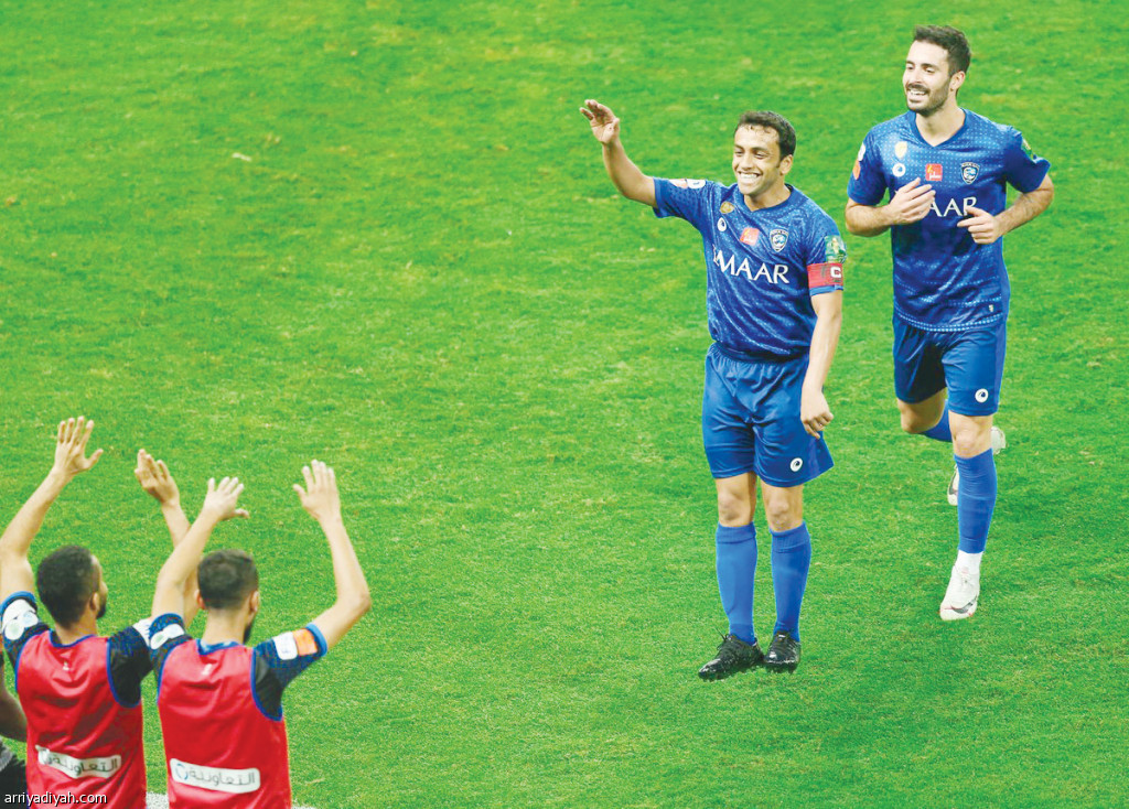 صورة التقطت أمس محمد الشلهوب قائد الهلال يحتفل بهدفه في مرمى عرعر بمشاركة أمير كردي زميله (المركز الإعلامي ـ الهلال)