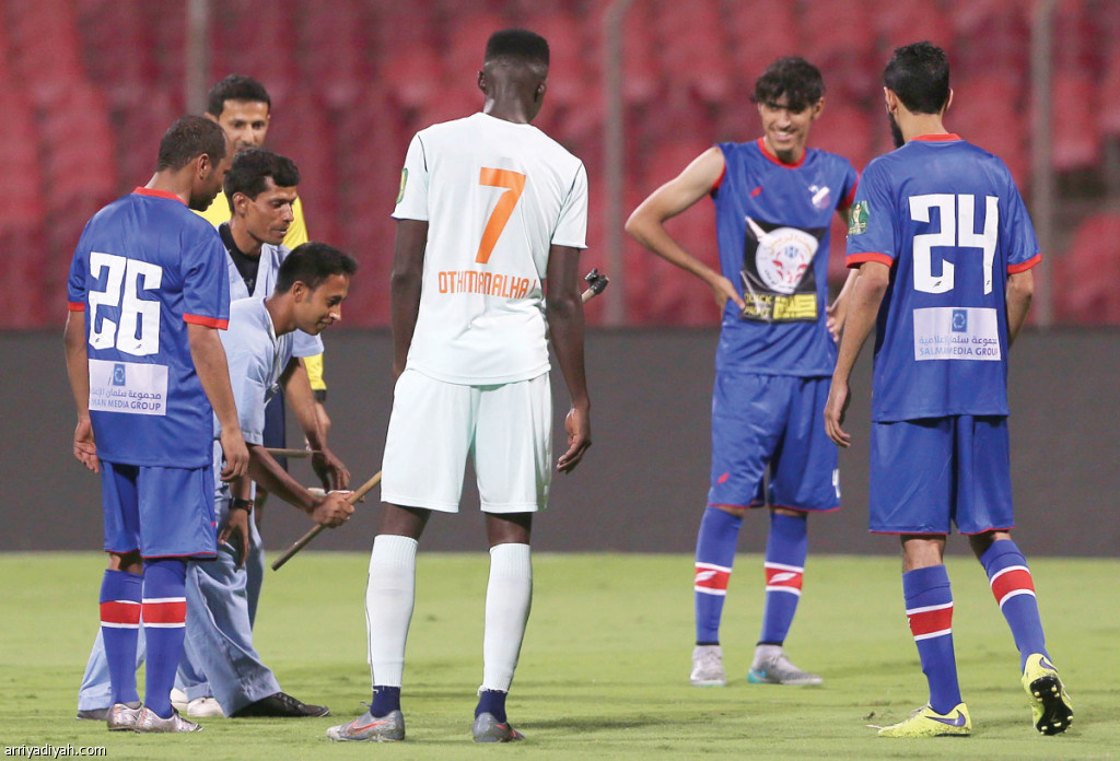 صورة التقطت أمس لأحد عمال منشأة ملعب الشرائع أثناء محاولته إمساك الثعبان وسط متابعة ماجد الشمراني حكم المباراة وبعض لاعبي الفريقين تصوير : عدنان مهدلي