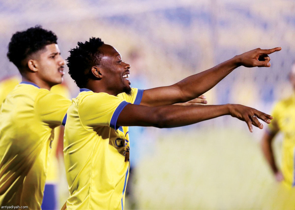 صورة التقطت أمس للنيجيري أحمد موسى وخالد الغوينم أثناء الحصة التدريبية لفريق النصر الأول لكرة القدم على ملعب النادي في الرياض استعداداً لمباراته اليوم أمام الفيصلي (المركز الإعلامي ـ النصر)