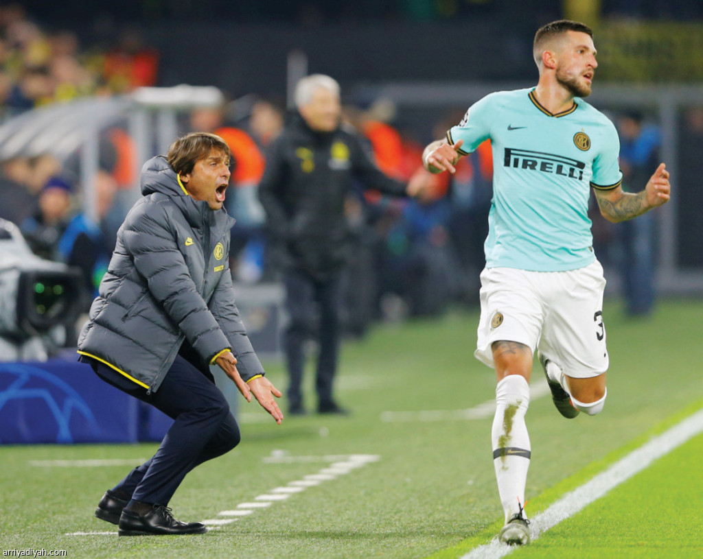 صورة التقطت أمس الأول لكونتي مدرب الإنتر وبيراجي لاعب الفريق أثناء المباراة أمام دورتموند التي انتهت 3ـ2 لدورتموند (الفرنسية)