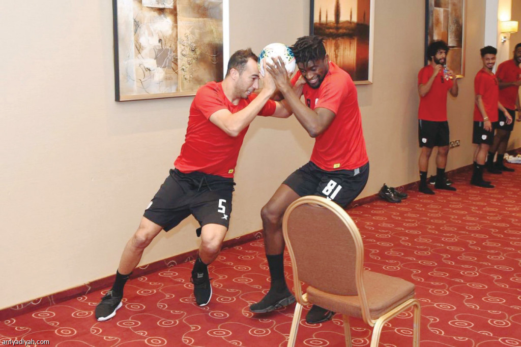 صورة التقطت أمس للسنغالي ألفريد والجزائري جمال بلعمري خلال التدريب الترفيهي في الفندق (المركز الإعلامي ـ الشباب)