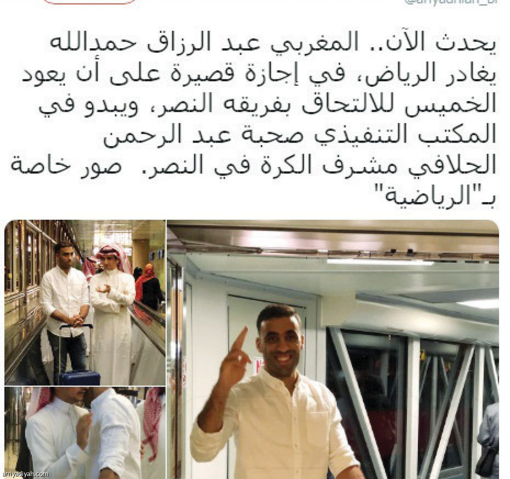 وكان حساب الصحيفة على تويتر انفرد بنشر صور خاصة لحمد الله خلال إنهاء إجراءات سفره أمس الأول عبر المكتب التنفيذي في مطار الملك خالد الدولي في الرياض في طريقه إلى أبوظبي ومنها إلى الولايات المتحدة في إجازة قصيرة كانت قد تأجلت بسبب ما عرف بقضية المطار.