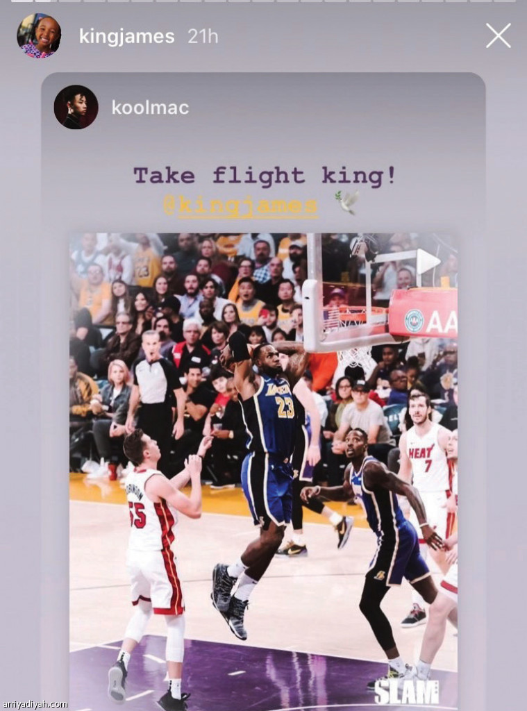 تغنَّى الأمريكي ليبرون جيمس، أسطورة كرة السلة الأمريكية، بنفسه عبر حسابه الرسمي في إنستجرام بعد تحقيقه نقطتين لفريقه خلال المباراة الماضية. إذ نشر صورة، توثق تسجيله النقطتين، وعلَّق عليها بـ "ملك الطيران".