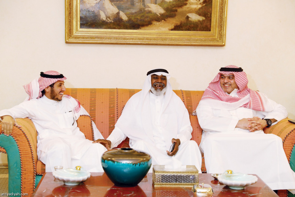 صورة التقطت أمس لسلمان المالك عضو شرف النصر وصفوان السويكت رئيس النادي مع غانم الدوسري عم موظفة المطار أثناء استضافته إدارة النادي تصوير: فهد المري