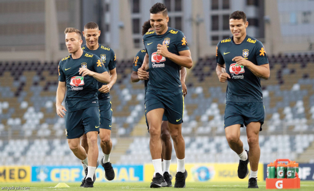 صورة التقطت أمس لتياجو سيلفا وكاسميرو وآرتور ميلو أثناء الحصة التدريبية للبرازيل على ملعب آل نهيان في أبوظبي قبل مباراة الأرجنتين (المركز الإعلامي ـ مجلس أبوظبي الرياضي)