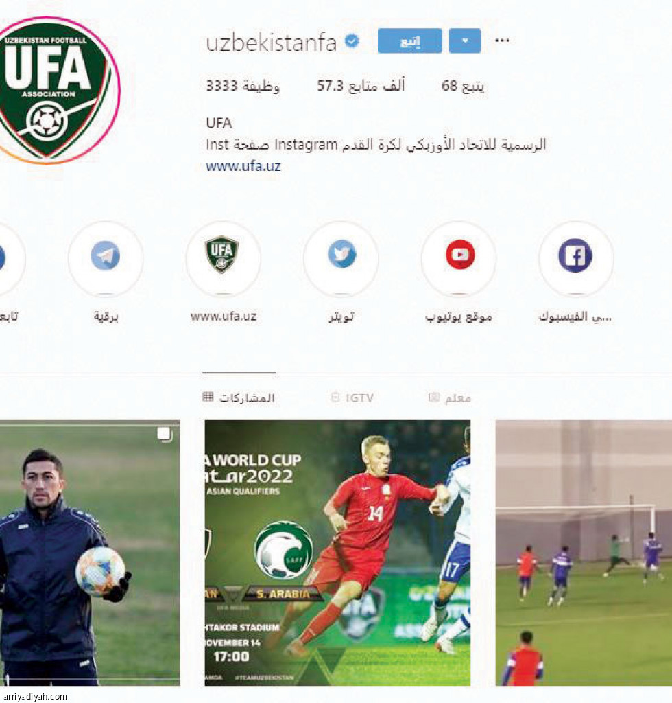 تتابع الجماهير الرياضية، ووسائل الإعلام المختلفة في منصات التواصل الاجتماعي "تويتر، إنستجرام، وفيس بوك" حسابات المنتخب السعودي الأول لكرة القدم، ومنتخب أوزبكستان فيها لمعرفة آخر أخبار المنتخبين، واستعداداتهما للمواجهة المرتقبة بينهما، غدًا، ضمن تصفيات كأس العالم 2022، وآسيا 2023.