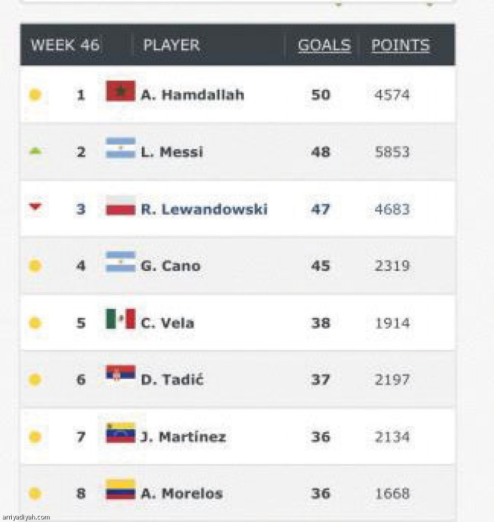 ينافس المغربي عبد الرزاق حمد الله، مهاجم فريق النصر الأول لكرة القدم، النجمين العالميين الأرجنتيني ليونيل ميسي، قائد برشلونة، والبولندي ليفاندوفيسكي، مهاجم بايرن ميونيخ، على جائزة هدَّاف العام على مستوى العالم. وقد تغنَّت الجماهير النصراوية في تويتر بأهداف المهاجم المغربي "50 هدفًا، بفارق هدفين عن ميسي".