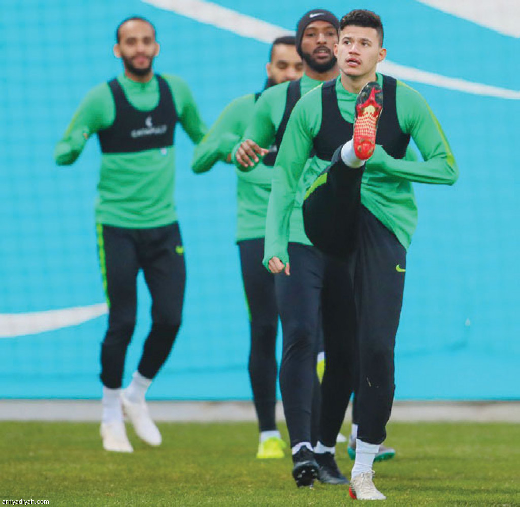 صورة التقطت أمس للحمدان لاعب المنتخب السعودي يتقدم زملاءه أثناء تمارين اللياقة (المركز الإعلامي ـ المنتخب السعودي)