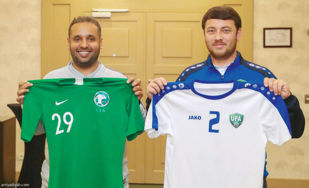 صورة التقطت أمس لممثلي المنتخبين السعودي والأوزبكي يستعرضان قميصي مباراة اليوم أثناء الاجتماع الفني (المركز الإعلامي ـ المنتخب السعودي)