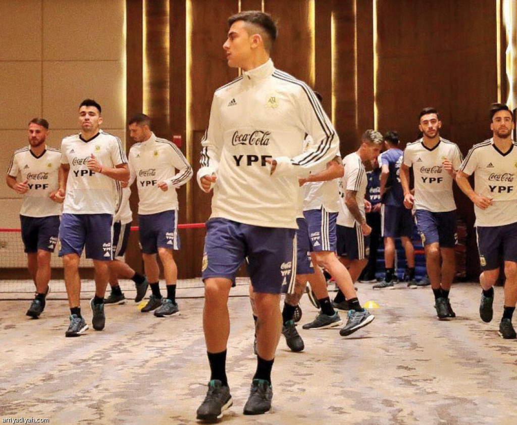 صورة التقطت أمس من تدريبات الأرجنتين في الفندق ويظهر دي بالا (المركز الإعلامي ـ الاتحاد الأرجنتيني)