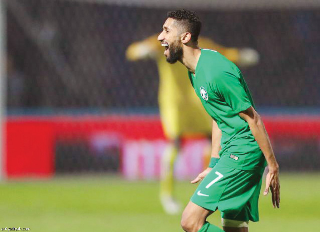 صورة التقطت أمس سلمان الفرج يحتفل بهدفه الثاني في مرمى أوزبكستان (المركز الإعلامي ـ المنتخب السعودي)
