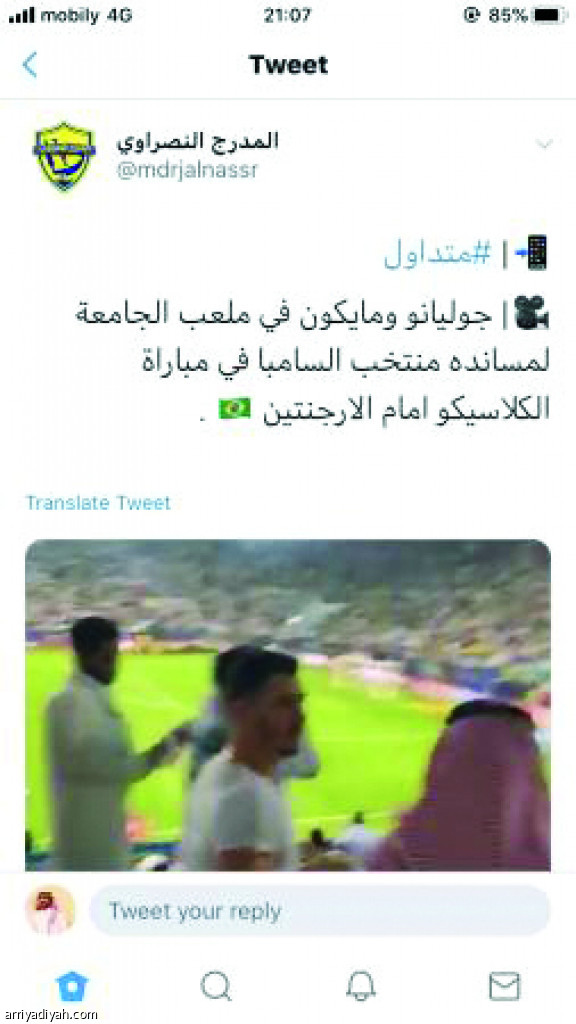 تداولت الجماهير النصراوية بشكل خاص والسعودية بشكل عام، في منصة التواصل الاجتماعي "تويتر"، حضور الثنائي البرازيلي جوليانو ومايكون، لاعبي فريق النصر الأول لكرة القدم، لمواجهة منتخب بلادهما نظيره الأرجنتيني أمس في الرياض، ونال الفيديو أكثر من 10 آلاف مشاهدة.
