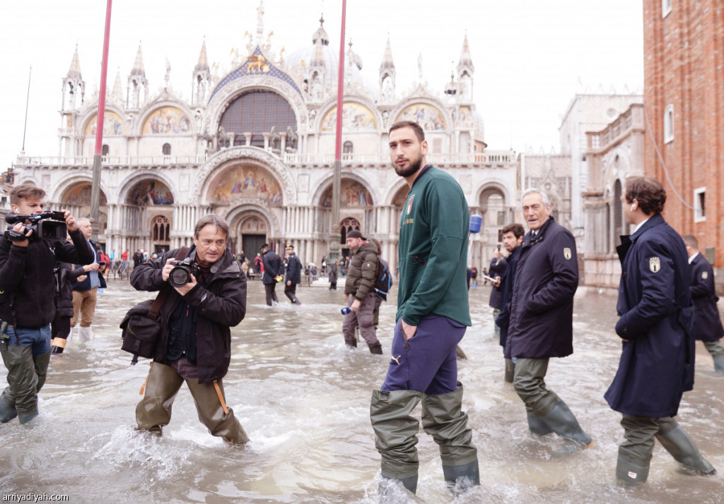 صورة التقطت أمس لدوناروما حارس فريق أي سي ميلان في ميدان سان مارك في البندقية يتجول بعد تعرض المدينة لفيضانات أدت إلى إعلان إيطاليا حالة الطوارئ في الأيام الماضية وتسببت في خسائر مالية