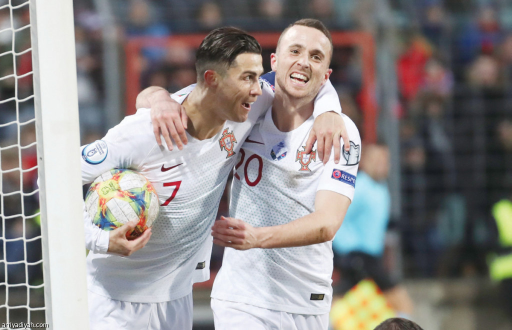 صورة التقطت أمس لرونالدو يحتفل بهدفه الـ99 الذي سجله في شباك لوكسمبورج ويظهر ديوجو جوتا زميله (الفرنسية)