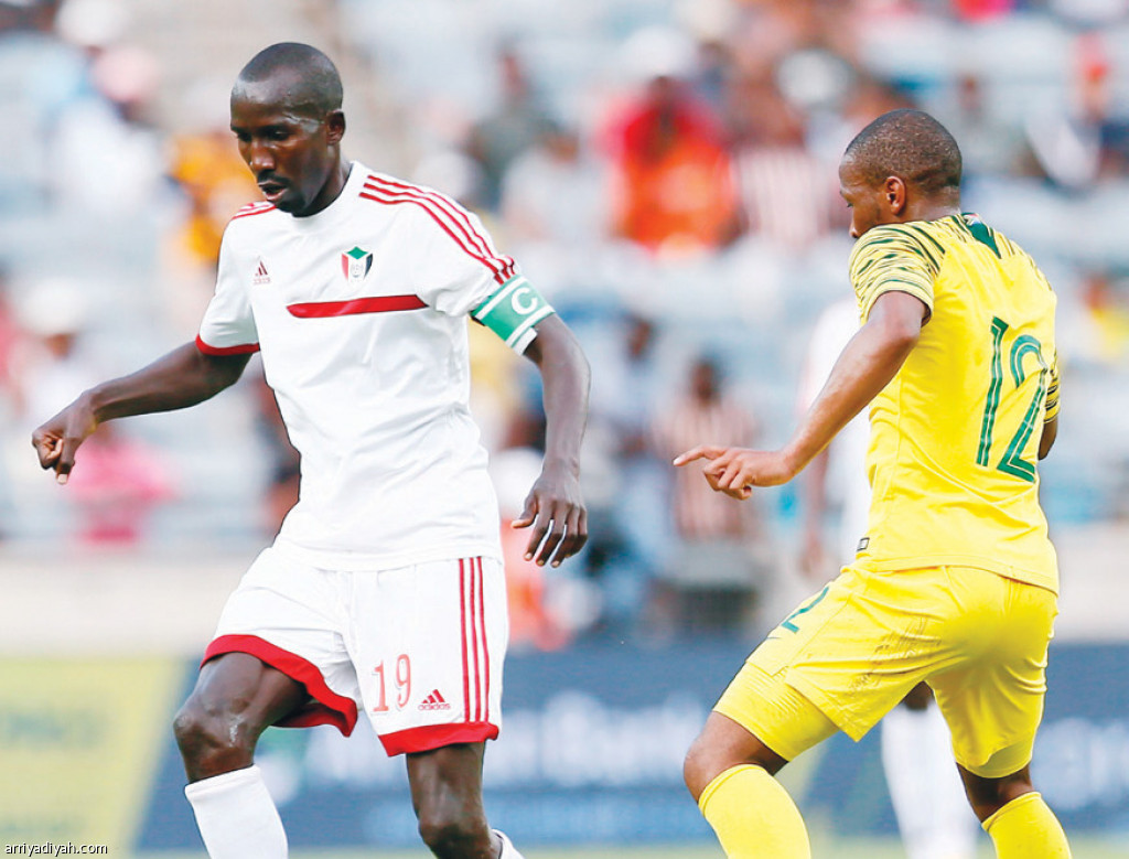 صورة التقطت أمس لموكوتجو لاعب جنوب إفريقيا ونصر الدين عمر لاعب السودان خلال مباراة الفريقين أمس (الفرنسية)