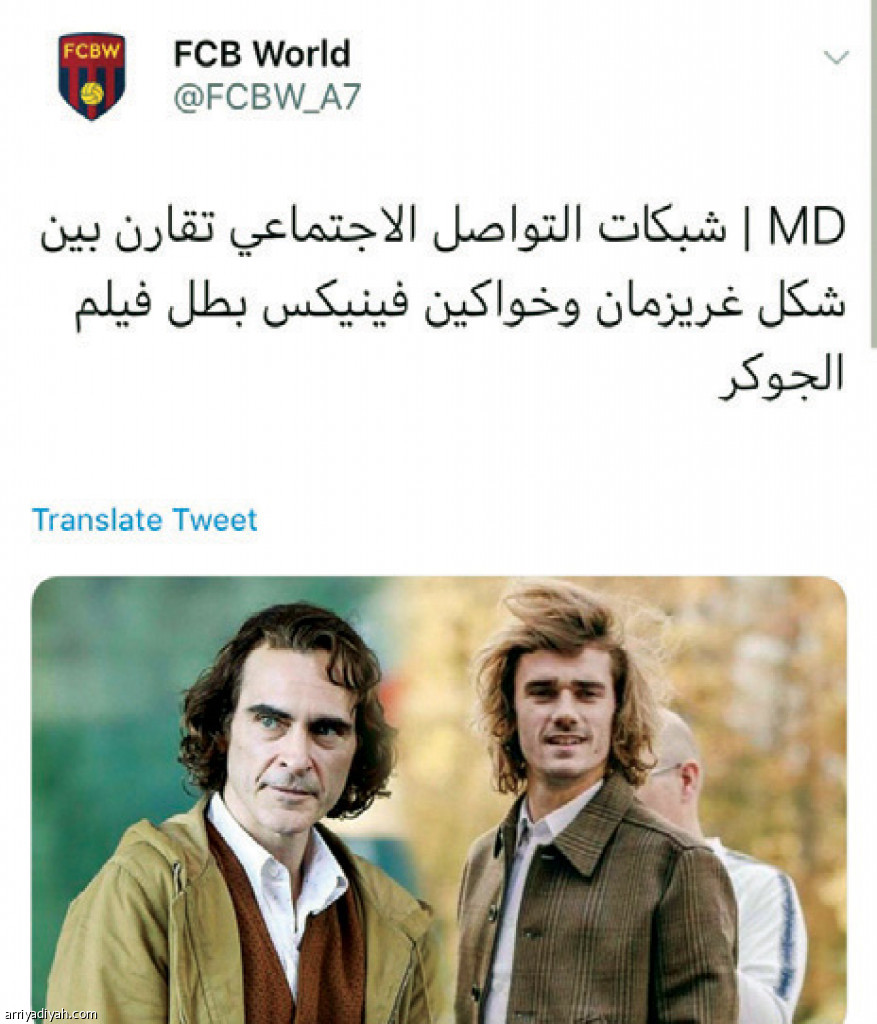 تداولت الجماهير الرياضية في منصة التواصل الاجتماعي الشكل الجديد للفرنسي جريزمان لاعب فريق برشلونة الإسباني الأول لكرة القدم. وشبهت الجماهير اللوك الجديد للاعب في معسكر بلاده، بالأمريكي خوان فينيكس بطل فيلم الجوكر.