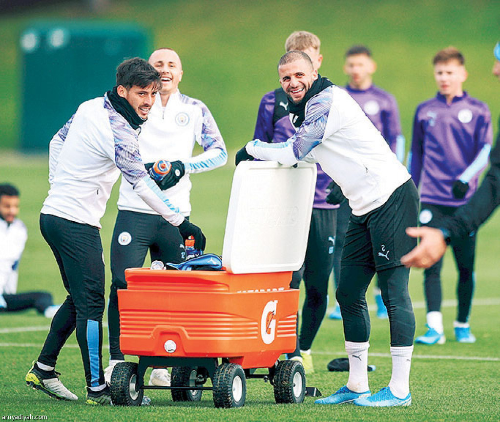 صورة التقطت أمس للإسبانيين ديفيد سيلفا وأنجلينيو وكيلي والكر في استراحة قصيرة أثناء تدريبات فريق مانشستر سيتي على ملعب أكاديمية النادي (المركز الإعلامي ـ السيتي)