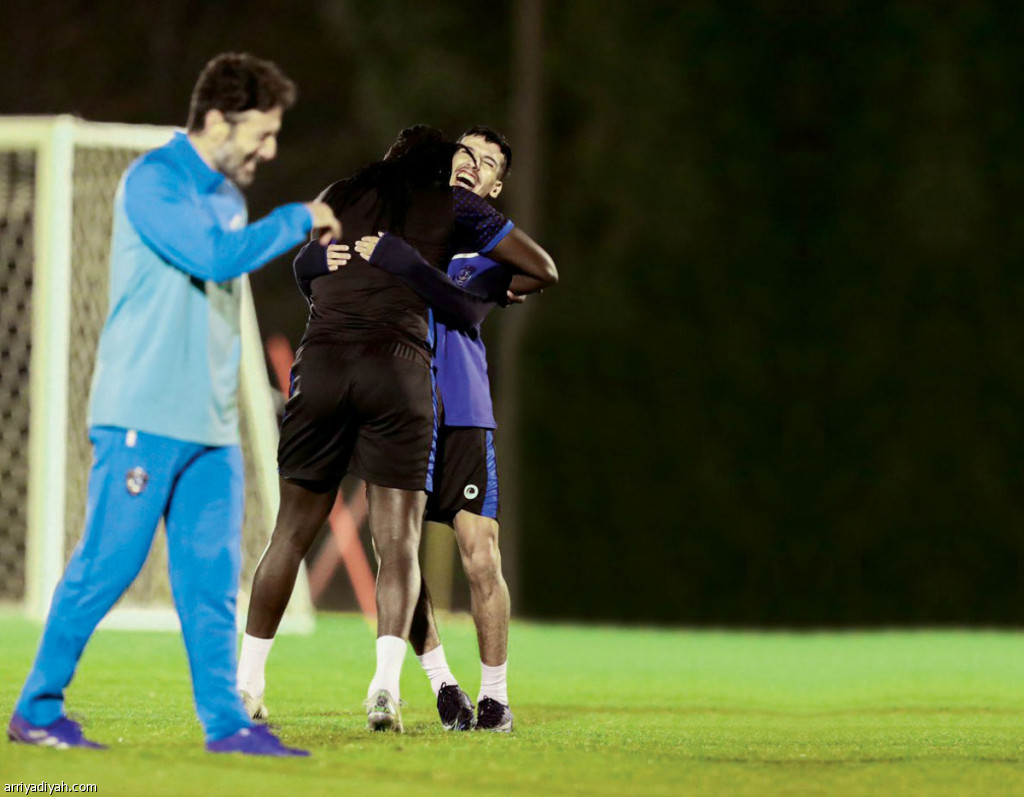 صورة التقطت أمس لبافيتمبي جوميز يعانق ذعار الحربي أثناء تدريبات الهلال استعدادًا لمباراة أوراوا ويظهر أحد أفراد الجهاز الفني (المركز الإعلامي ـ الهلال)