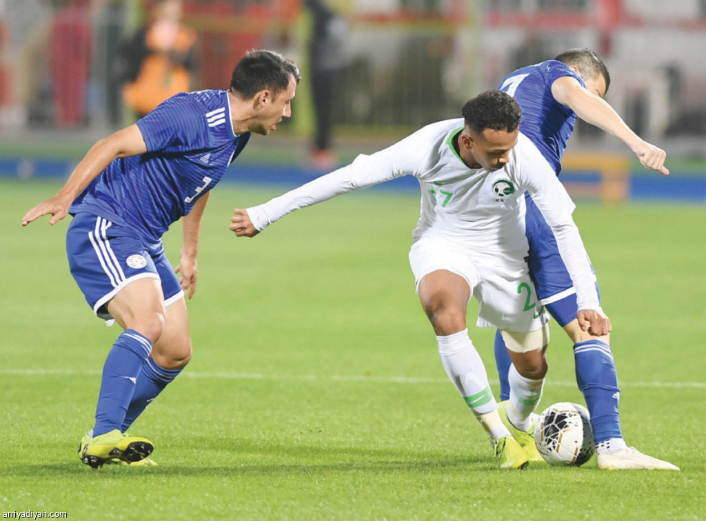 وقف الفرنسي رينارد مدرب الأخضر السعودي على أداء تركي العمار اللاعب الواعد بعدما منحه الفرصة في الشوط الثاني من مواجهة الباراجواي التجريبية.. وفي الصورة التي التقطت أمس العمار في صراع على الكرة مع أحد لاعبي الباراجواي تصوير: بشير صالح