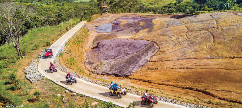 صورة التقطت لسياح يقودون دراجات "بيتش باجي" بجوار الأرض ذات الـ 23 لوناً في حديقة ومحمية وادي الألوان الطبيعية في موريشيوس الواقعة وسط المحيط الهندي (الموقع الإلكتروني ـ وادي الألوان)