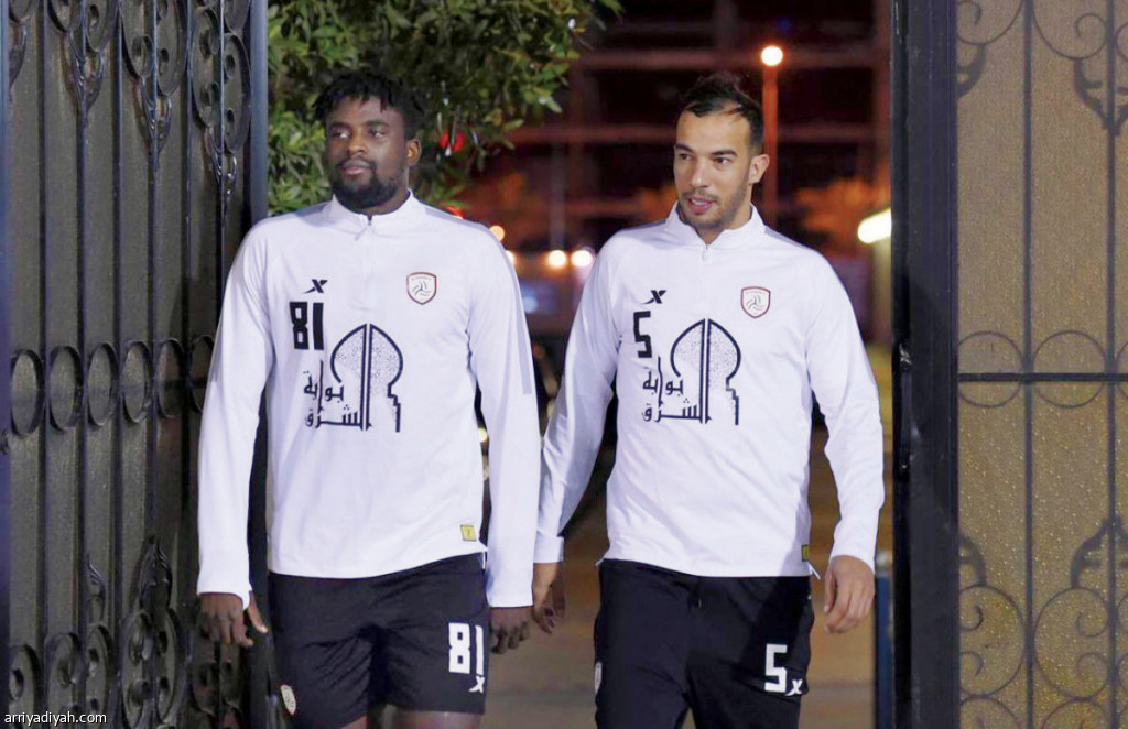 صورة التقطت أمس للجزائري جمال الدين بلعمري مدافع فريق الشباب الأول لكرة القدم في طريقه للدخول إلى التدريبات وإلى جانبه السنغالي ألفريد ندياي (المركز الإعلامي ـ الشباب)