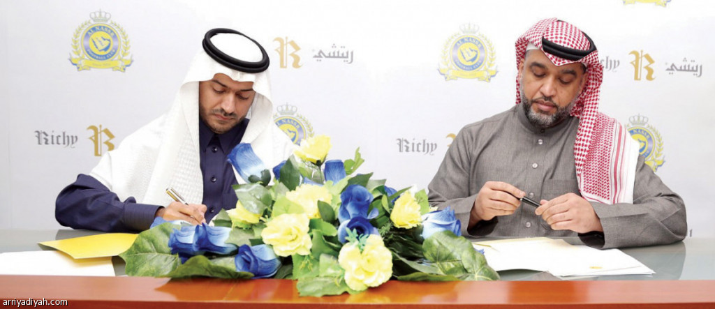 صورة التقطت أمس لناصر الجميد عضو إدارة النصر ومحمد العجلان الرئيس التنفيذي لشركة ريتشي للأثواب يوقعان شراكة تضع شعار الشركة على كتف قميص الفريق الأول تصوير: عبد العزيز النومان