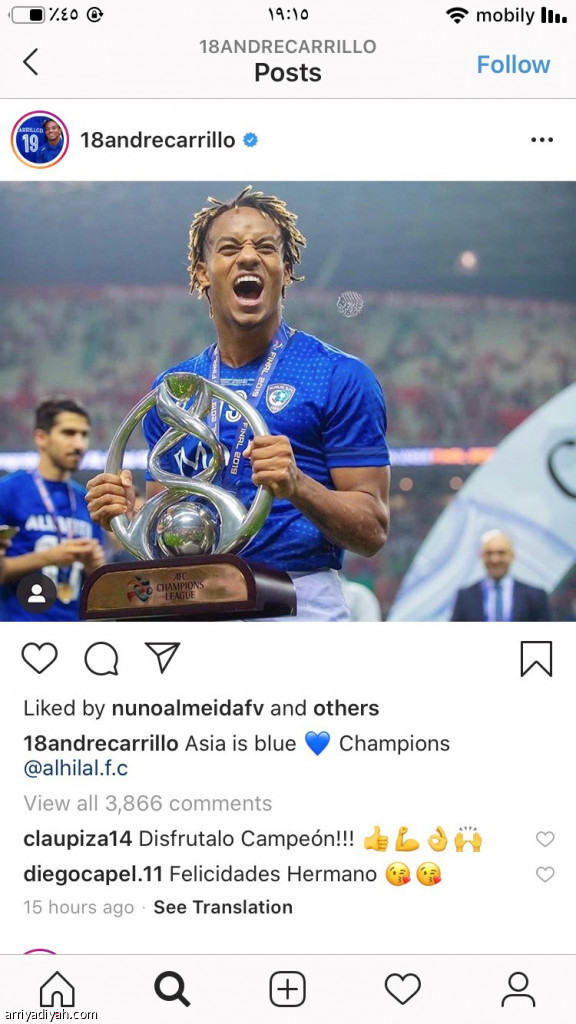 سيطر البيروفي أندريه كاريلو، لاعب وسط فريق الهلال الأول لكرة القدم، على أكثر لاعبي فريقه تفاعلاً وتداولاً بين الجماهير الزرقاء في منصة التواصل الاجتماعي إنستجرام، بعد تحقيق لقب دوري أبطال آسيا للمرة الأولى في المسمى الجديد.